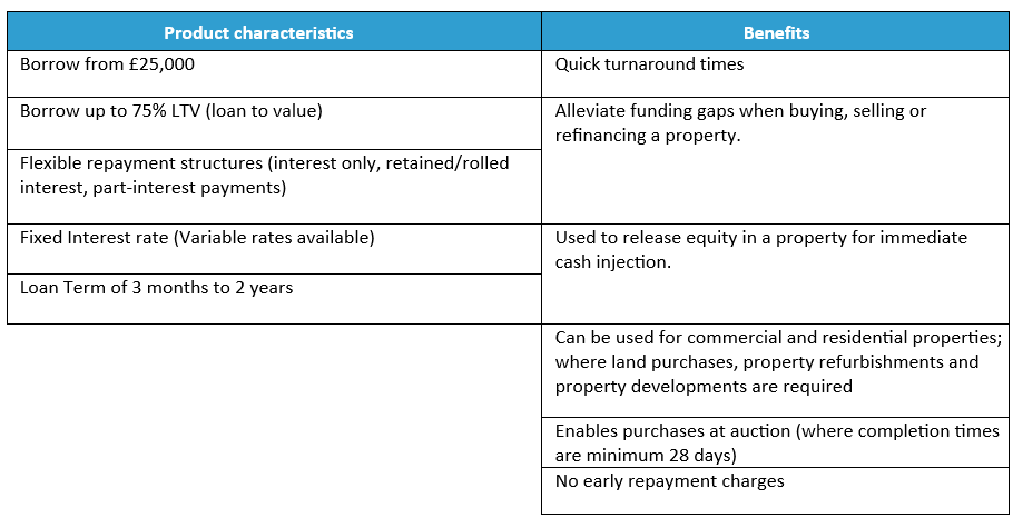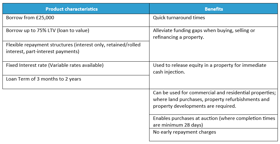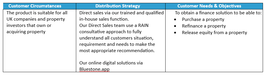 The product is designed to meet the needs of the target group, where key needs are; being able to access a short-term lend facility to be able to obtain a property or enhance via development in a short time frame. With the ability to offer flexible repayment structures to suit the required needs. The product features and criteria are designed to support these needs.